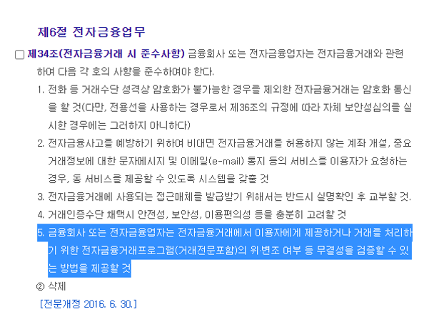 제34조 5항5. 금융회사 또는 전자금융업자는 전자금융거래에서 이용자에게 제공하거나거래를 처리하기 위한 전자금융거래프로그램(거래전문포함)의위·변조 여부 등 무결성을 검증할 수 있는 방법을 제공할 것