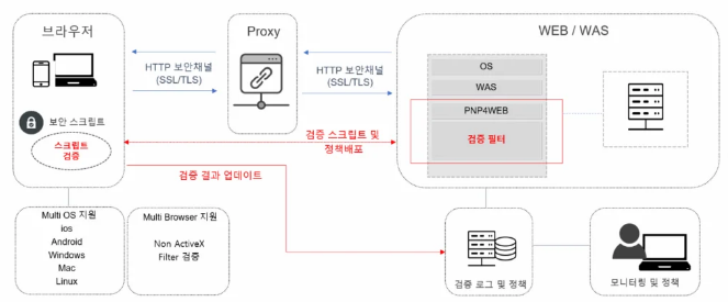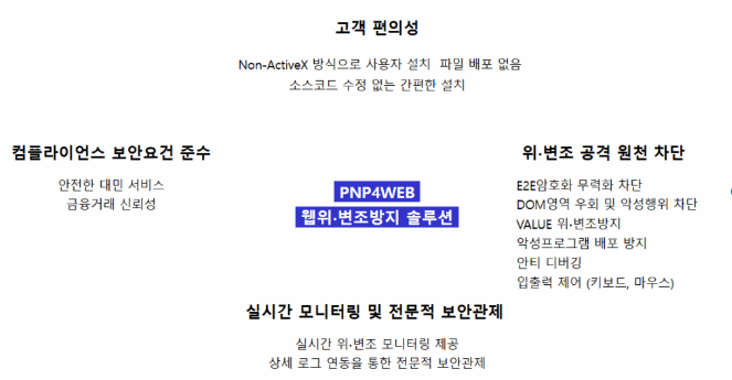 PNP4WEB 3.0 웹 위.변조방지 솔루션은 웹어플리케이션 공격을 클라이언트 측면에서 원천적으로 차단하여 보다 안전한 웹 서비스 환경을 제공합니다.